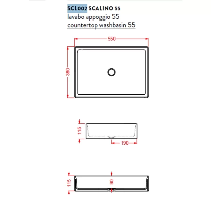 - SCALINO 38x55-1 — с одним отверстием под стандартный смеситель.