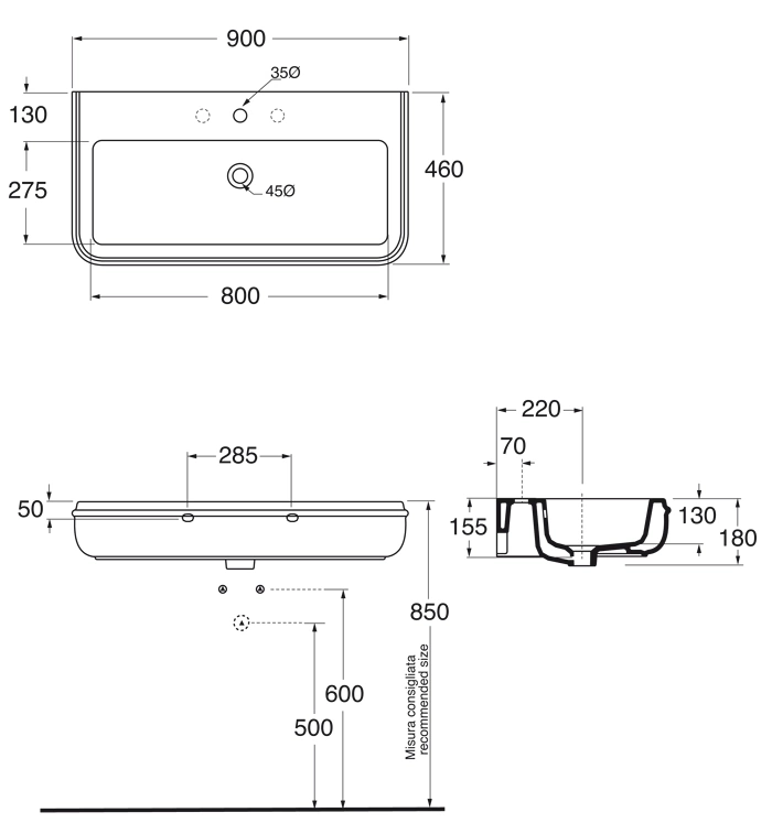 Раковина имеет прямоугольную форму с закругленными краями. Ее габаритные размеры составляют 90 см в ширину и 46 см в глубину. Эти параметры важно учитывать для планирования пространства ванной комнаты и выбора подходящей по размеру тумбы или консоли.