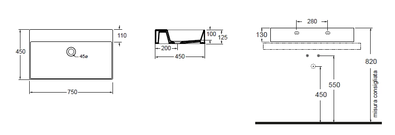 Габаритные размеры раковины: 75 см в длину, 45 см в глубину. Поскольку это подвесная модель, она не устанавливается на тумбу, а крепится к стене. Для нее необходимо предусмотреть настенную опору и коммуникации.
