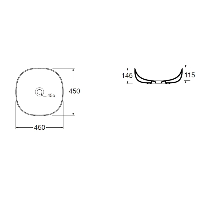 Точные размеры модели: 45 см в длину, 45 см в ширину и 11.5 см (115 мм) в высоту. Это компактная накладная раковина квадратной формы.