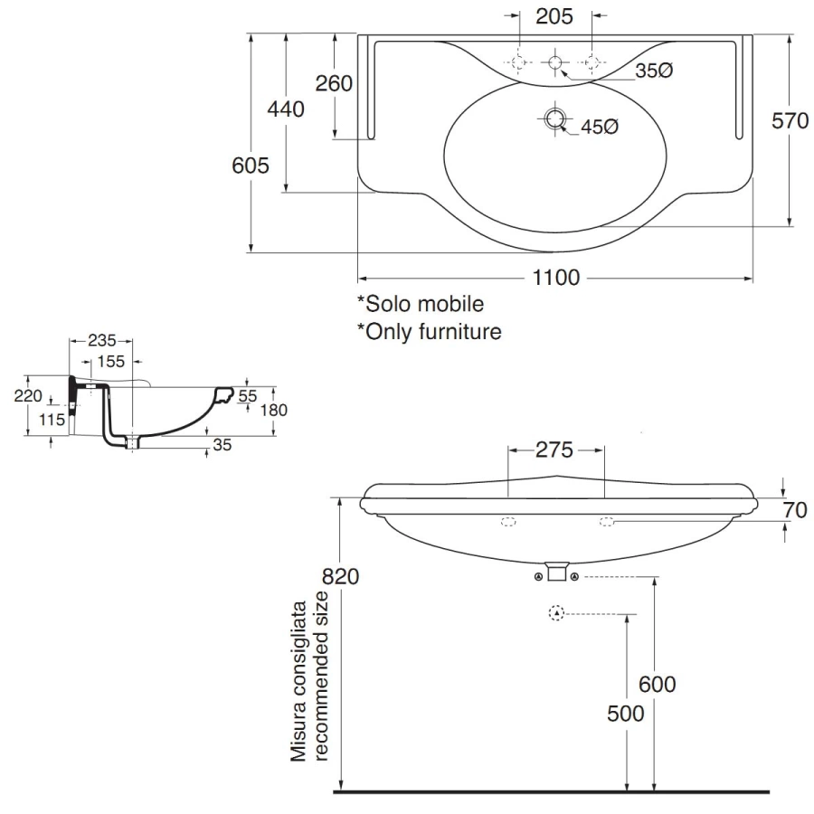 Три отверстия предназначены для установки смесителя отдельностоящего типа (с отдельными ручками горячей и холодной воды и изливом) либо термостатического смесителя. Стандартный центральный смеситель с одним рычагом для этой модели не подойдет.