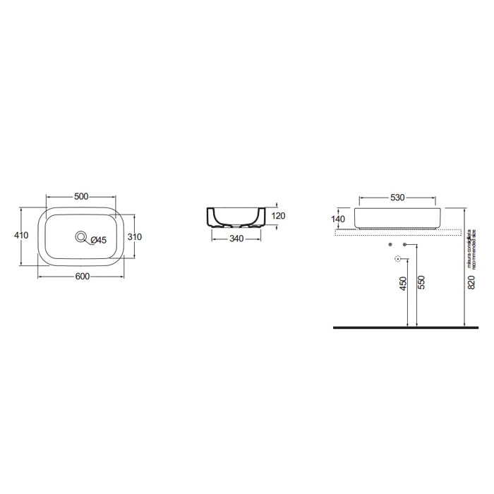 Габаритные размеры данной раковины составляют 60 см в длину, 41 см в ширину. При планировании учтите, что как накладная модель, она будет монтироваться поверх столешницы, поэтому общие занимаемые габариты будут немного больше.