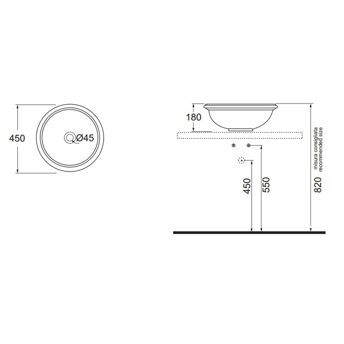 JUBILAEUM 45 круглый: диаметр 45 см, глубина 18 см. Версия без отверстий (как в описании) или с одним отверстием под смеситель.