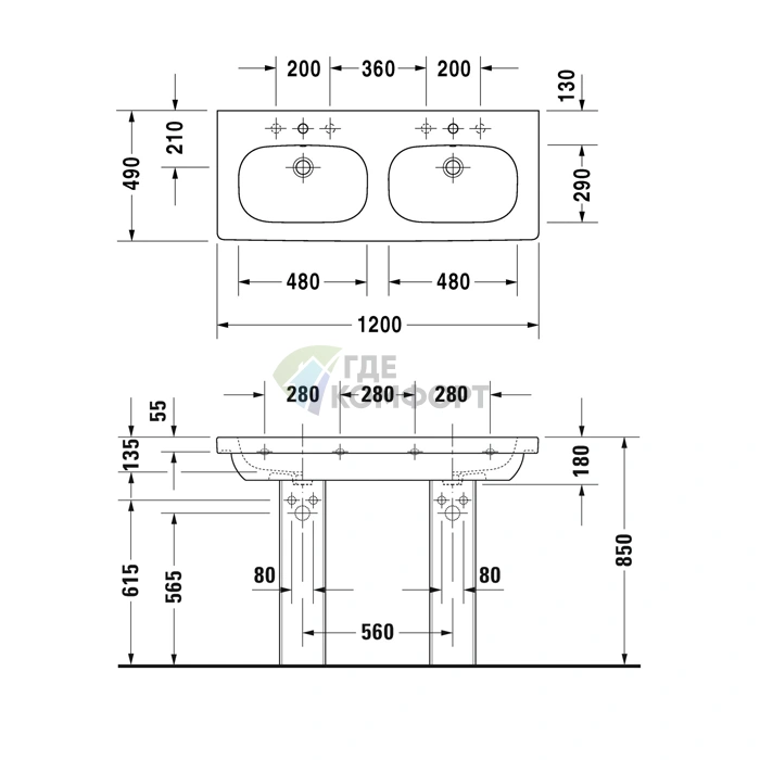 Габариты и установка раковины Duravit D-Code 1200x490 мм