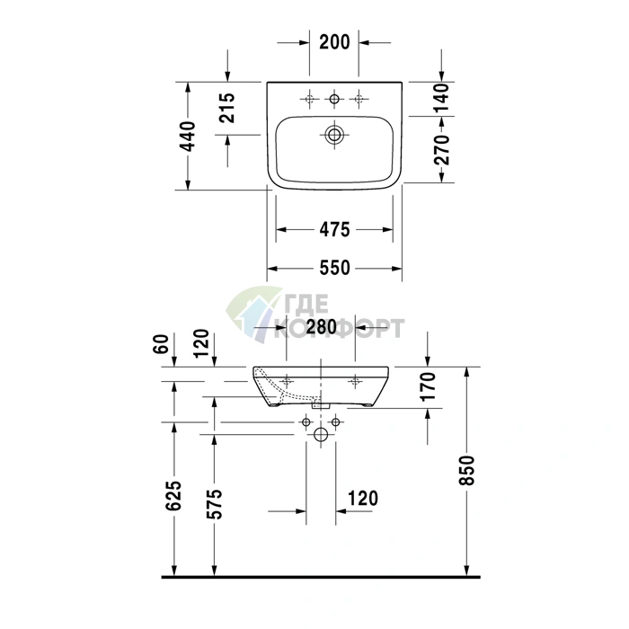 Габаритные размеры данной модели: 550 мм в ширину и 440 мм в глубину. Эти параметры указывают на внешний край раковины. Рекомендуется учитывать эти размеры при проектировании мебели (тумбы, столешницы) для ее последующей корректной установки.