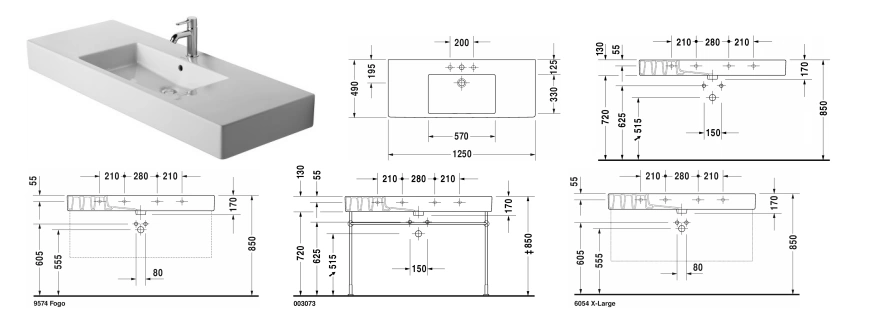 Точные размеры модели: 1250 мм в длину, 490 мм в глубину. Раковина предназначена для установки на мебельные тумбы соответствующего размера. При выборе мебели необходимо учитывать не только габариты чаши, но и пространство для монтажа, а также подводку коммуникаций.
