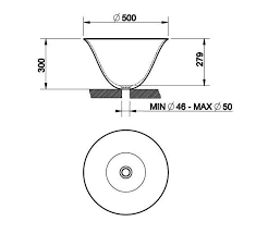 Раковина имеет круглую форму и внешний диаметр 40 см. Для ее монтажа в качестве накладной (top-mount) потребуется вырез в столешнице диаметром примерно 34-35 см. Точный рекомендуемый диаметр выреза указан в инструкции по установке.
