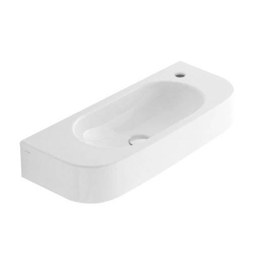 Монтаж подвесной раковины происходит на предварительно установленную инсталляцию. Это скрывает все коммуникации и сифон, создавая аккуратный, завершённый вид. Отверстие под смеситель расположено справа, что учитывает наиболее распространённую схему подвода воды и упрощает установку.