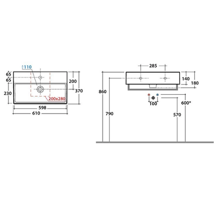 Размеры раковины составляют 610 мм в длину, 370 мм в ширину. Высота изделия обычно составляет около 150 мм, но рекомендуется уточнять этот параметр в технической документации. Данный размер является компактным и подходит для малогабаритных ванных комнат.
