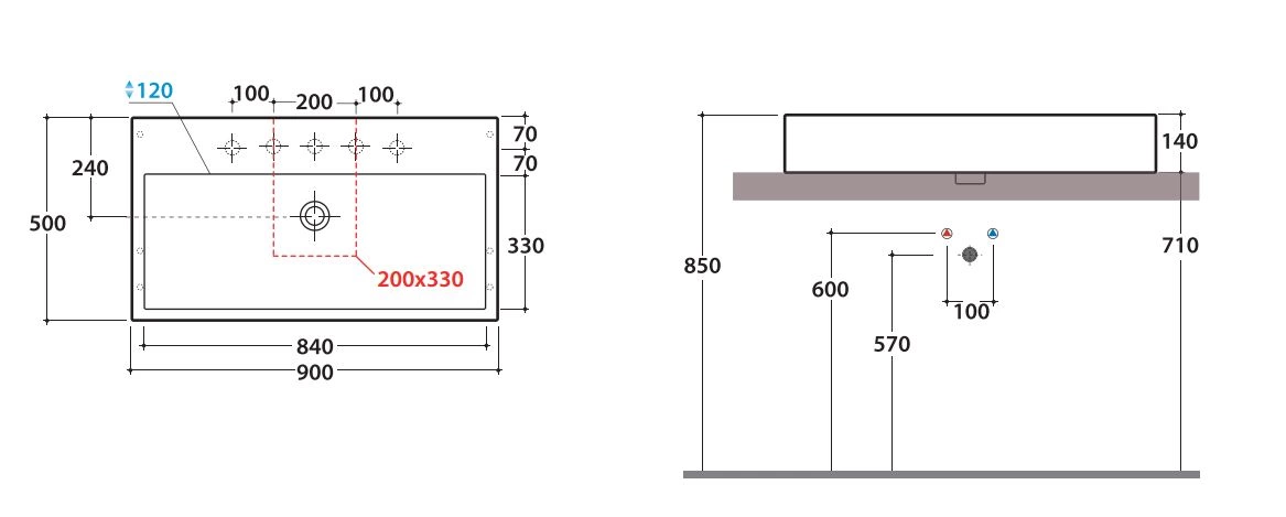 Габаритные размеры раковины: 90 см (длина) х 50 см (ширина) х 14 см (высота). Для комфортной установки накладным способом столешница или тумба должны иметь вырез (посадочное место) соответствующих размеров, обычно на 2-3 см меньше габаритов раковины. Рекомендуем уточнить монтажные размеры в технической документации к конкретной модели.