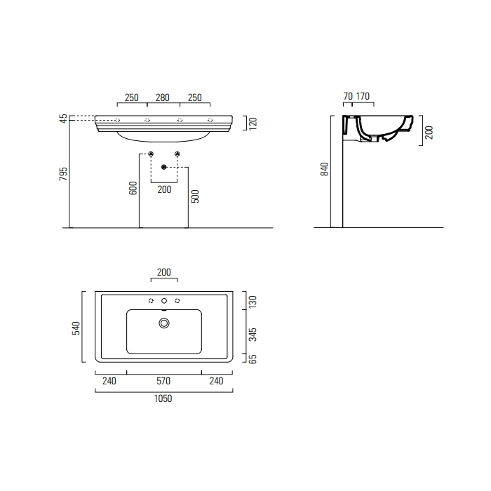Габаритные размеры модели составляют 105 см в длину, 54 см в ширину. Высота раковины вместе с ножками составляет примерно 85-87 см, что является стандартной комфортной высотой для установки в ванной комнате.