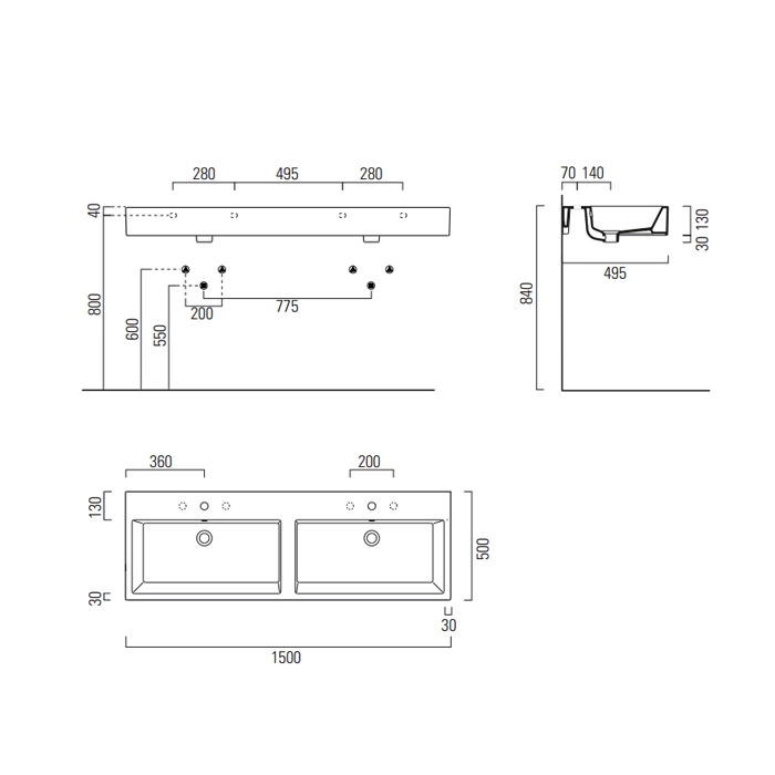 Точные габаритные размеры данной модели составляют 150 см в длину, 50 см в глубину. Высота изделия и размеры каждой чаши указаны в технической спецификации. Рекомендуем свериться с чертежом перед монтажом.