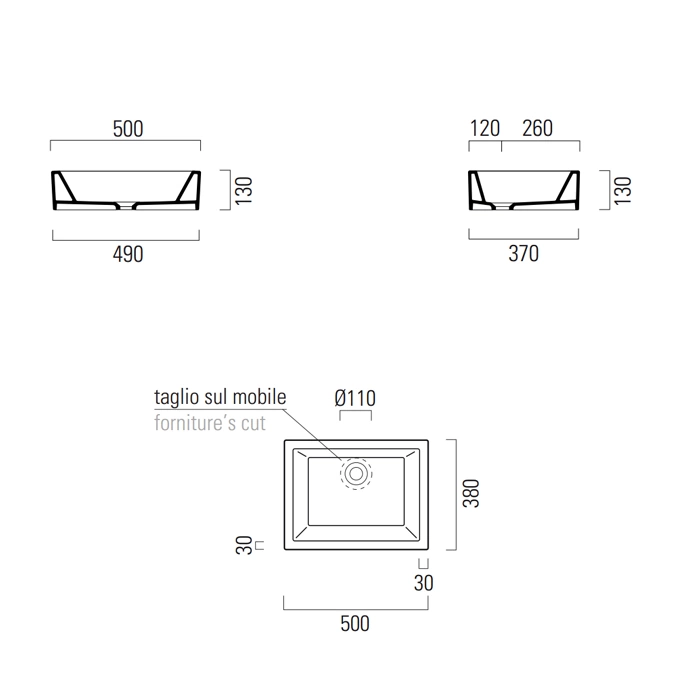 Ключевая особенность модели — конструкция без отверстия под смеситель. Это дает полную свободу в выборе места установки крана: его можно смонтировать непосредственно на столешнице или на стене рядом с раковиной.