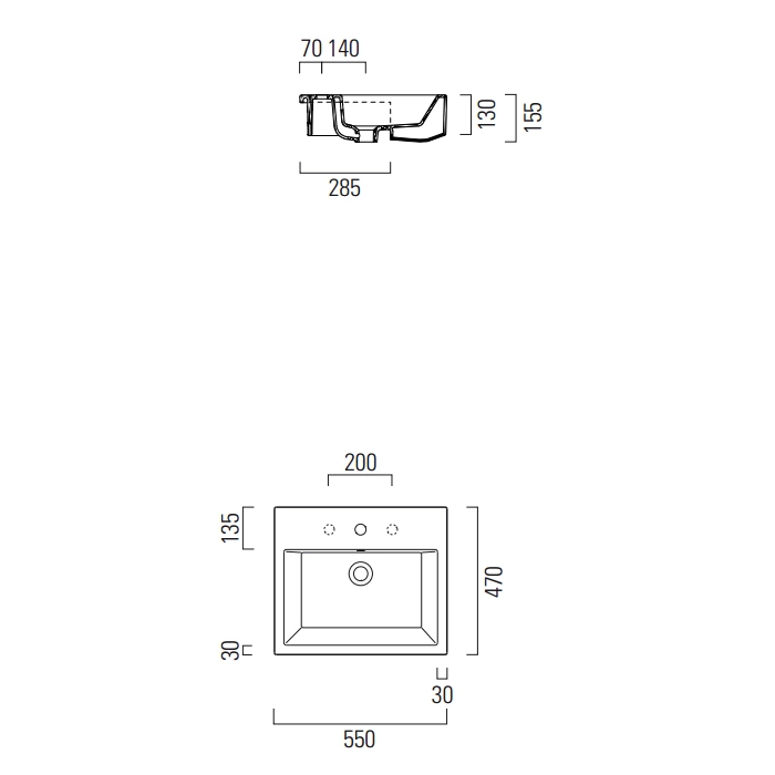 Габаритные размеры раковины GSI Kube составляют 55 см в длину, 47 см в ширину. Рекомендуется уточнять необходимые размеры посадочного отверстия в столешнице в технической документации к конкретной модели.
