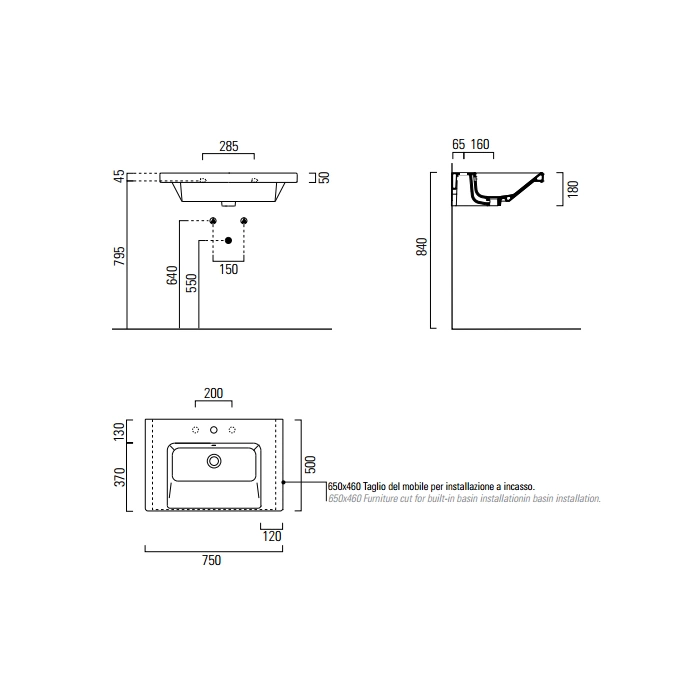 Габаритные размеры раковины: 75 см (длина) × 50 см (ширина) × 18 см (высота). Для встраивания в столешницу необходимо вырезать монтажное отверстие по прилагаемой к изделию схеме или инструкции. Точные размеры отверстия могут незначительно отличаться от габаритов чаши.
