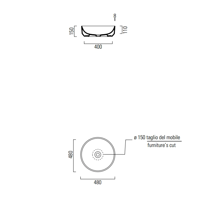 - Конструкция: Накладной монтаж. Раковина устанавливается поверх готовой столешницы, что минимизирует сложность работ и позволяет легко произвести замену в будущем.