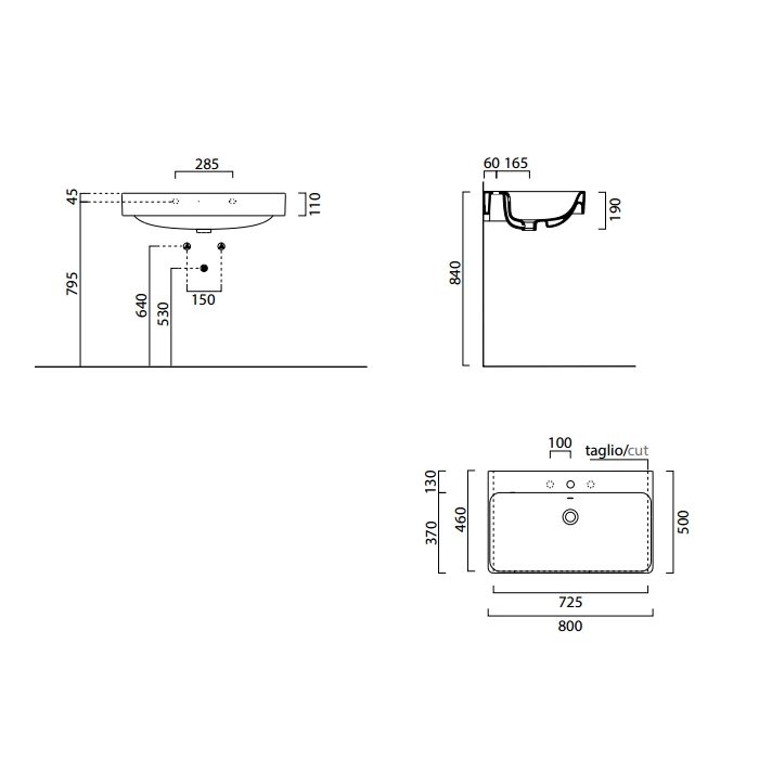 Раковина GSI Sand имеет прямоугольную форму. Её габаритные размеры составляют 80 см в ширину, 50 см в глубину. Высота изделия стандартна для подвесных моделей. Рекомендуем заранее проверить эти размеры на месте установки, учитывая необходимые отступы от стен и мебели.