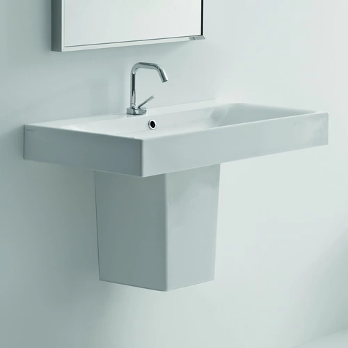 Одно отверстие под смеситель упрощает монтаж. Полупьедестал выполняет не только декоративную роль, маскируя инженерные коммуникации, но и служит дополнительной опорой, повышая устойчивость конструкции.