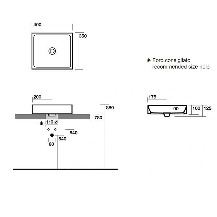 Габаритные размеры модели составляют 400 мм в длину и 350 мм в ширину. Рекомендуем заранее измерить площадь вашей столешницы или тумбы, учитывая необходимые технологические отступы для комфортного монтажа и использования.