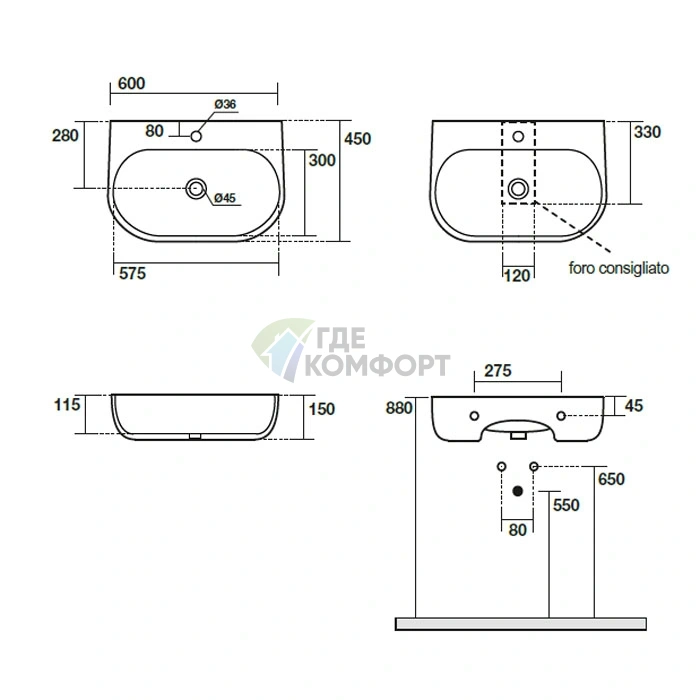 Габаритные размеры модели - 600x450 мм, глубина чаши около 150 мм. Вес раковины составляет примерно 10-12 кг в зависимости от цвета. Это стандартный вес для керамической раковины такого размера, обеспечивающий устойчивость при правильном монтаже. Для подвесной установки убедитесь, что крепежная система или стена рассчитаны на такую нагрузку.