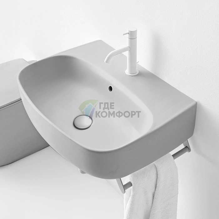 Светло-серый цвет раковины - прекрасный фон для акцентной фурнитуры. Попробуйте установить смеситель и донный клапан в цвете матовый черный, графит или сатинированная латунь. Это создаст по-настоящему дизайнерский вид.