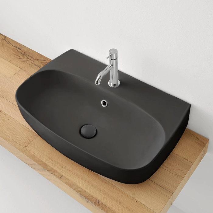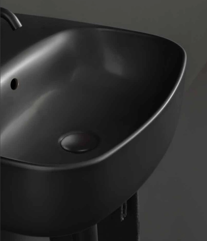 Раковина изготовлена из высококачественного сантехнического фарфора, который отличается повышенной прочностью и долговечностью. Глубокий чёрный матовый цвет придаёт интерьеру стильный и современный вид, а гладкая поверхность устойчива к загрязнениям и легко очищается.