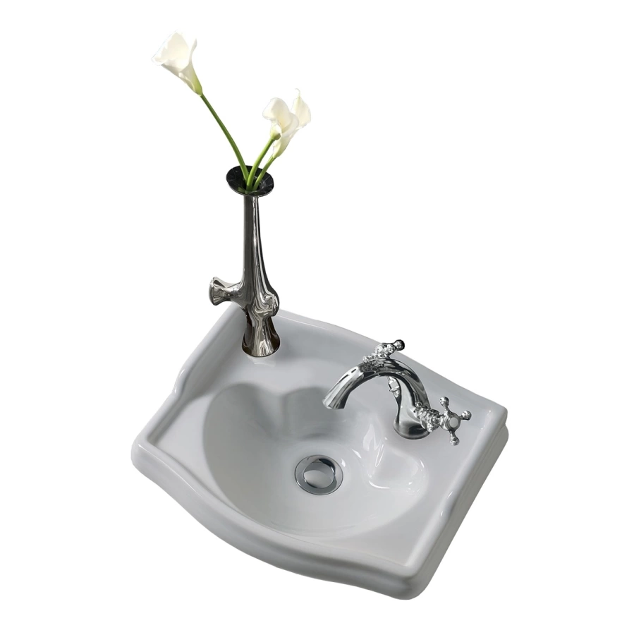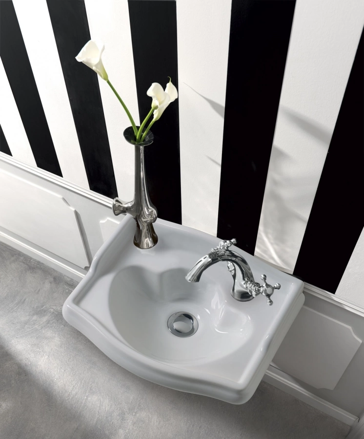 Это означает, что она предназначена для установки большинства настольных смесителей с одним изливом. Такое решение типично для ретро-стиля и упрощает монтаж. Вам не нужно сверлить керамику, достаточно подобрать смеситель с соответствующей консолью.