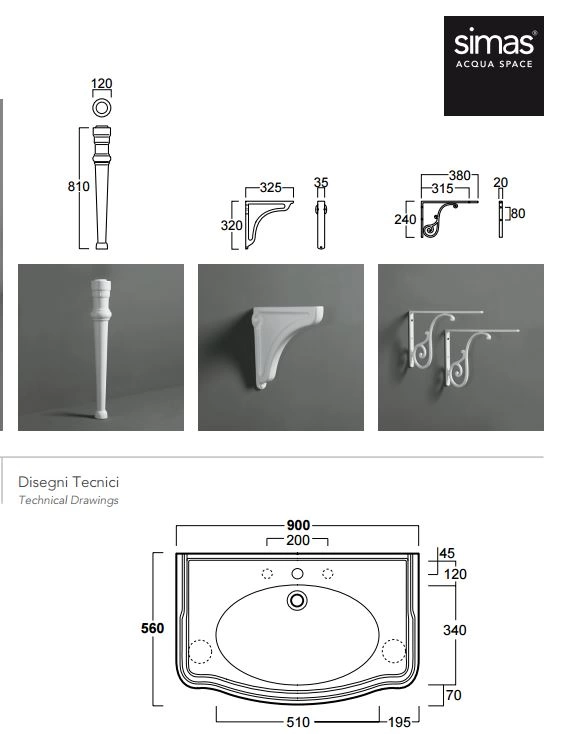 Раковина SIMAS Arcade 90 90x56 белая с 3 отверстиями и металлическими кронштейнами