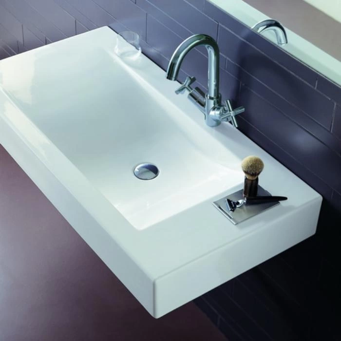 - Удобный форм-фактор: ширина 100 см и глубина 50 см обеспечивают простор для гигиенических процедур, а встроенное отверстие под смеситель упрощает установку.