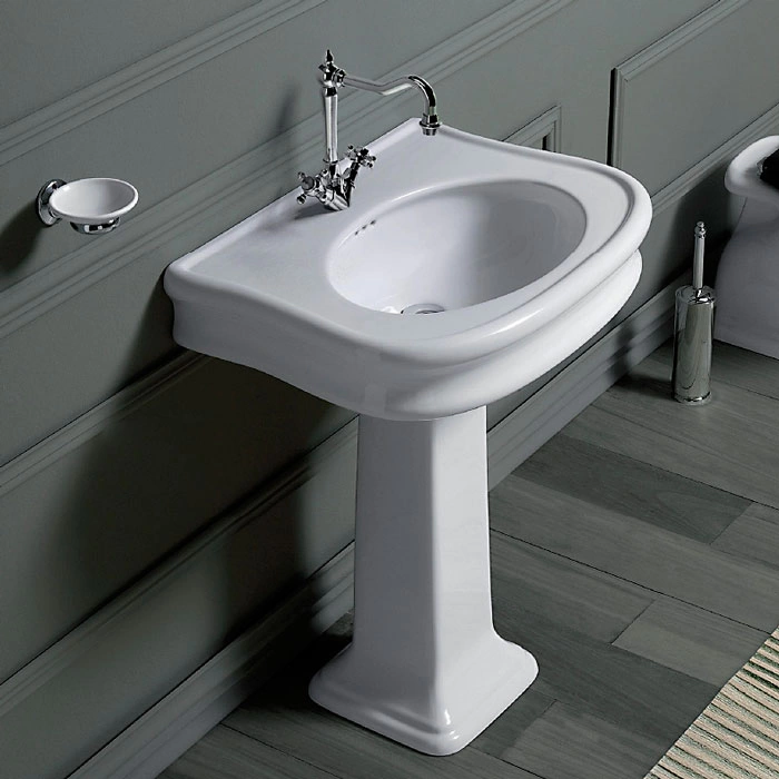 Накладная керамическая раковина для ванной комнаты, которая сочетает классический дизайн с функциональностью. Модель с пьедесталом относится к категории сантехники, обеспечивающей комфортное ежедневное использование и эргономичную организацию пространства.