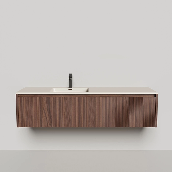При выборе мебели для ванной важна не только эстетика, но и долговечность. Комбинация материалов в данной модели решает эти задачи. Искусственный камень RAL 9001 стоек к царапинам и бытовой химии, а шпонированные фасады сохраняют стабильность геометрии во влажной среде. Интегрированная мойка создает целостную поверхность, на которой удобно разместить косметику или аксессуары.