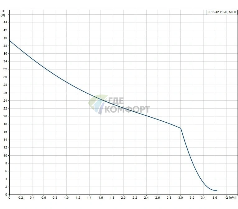 Модель JP 3-42 PT-H демонстрирует оптимальный баланс производительности и напора. Максимальный напор составляет 42 метра, а производительность достигает 3 кубометров в час. Этого достаточно для обеспечения водой дома с 2-3 санузлами.