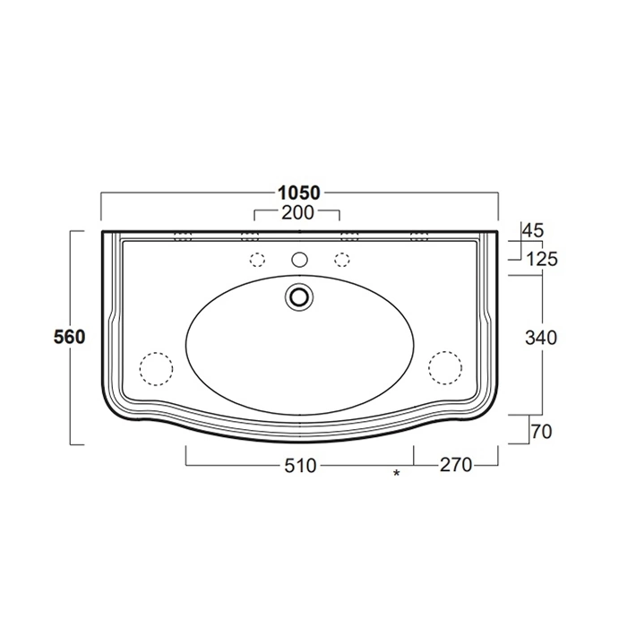 Раковина имеет три подготовленных отверстия для установки смесителя. Два из них уже выбиты на заводе, что облегчает стандартный монтаж. Третье отверстие отмечено контуром и может быть аккуратно выбито вручную на месте для установки смесителя с нестандартной компоновкой или дополнительного оборудования.