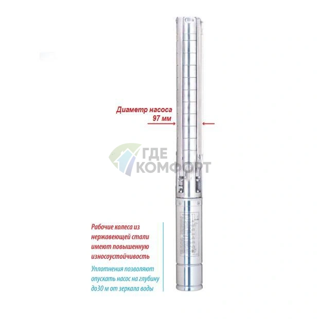 Многоступенчатая система обеспечивает высокое давление в системе водоснабжения даже при большой глубине погружения. Корпус из нержавеющей стали AISI 304 гарантирует долговечность и защиту от коррозии.