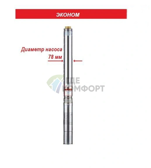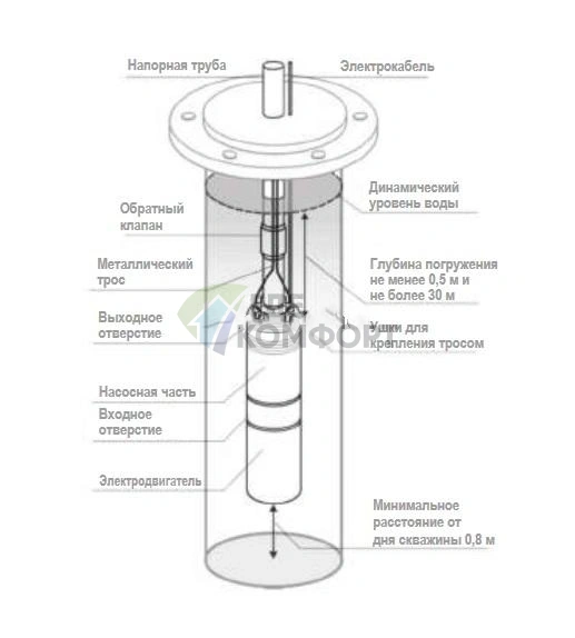 Насос эффективно работает в скважинах с внутренним диаметром обсадной трубы от 90 мм. Рекомендуется комплектовать систему обратным клапаном и реле давления для автоматизации работы.