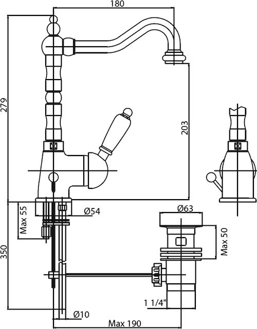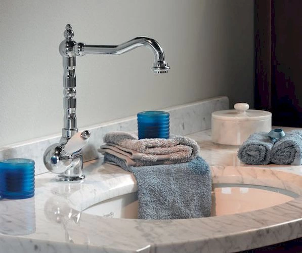 Смеситель оснащен высоким поворотным изливом. Это обеспечивает удобное использование раковины, позволяет без проблем наполнять глубокие емкости и направлять струю в нужную часть чаши.