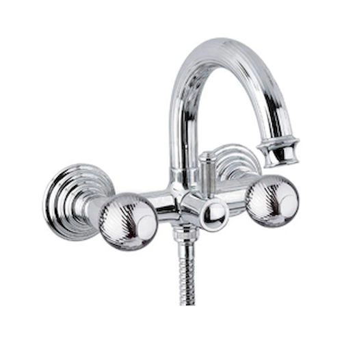 - Комплектация: смеситель, излив, душевой шланг (1.5 м), лейка, держатель для лейки, эксцентрики