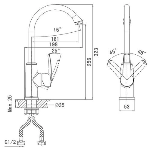 - Высокий поворотный излив, обеспечивающий дополнительное пространство в мойке.