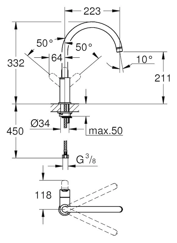 - Конструкция излива: Высокий поворотный излив длиной 260 мм обеспечивает удобный доступ воды ко всей площади мойки.