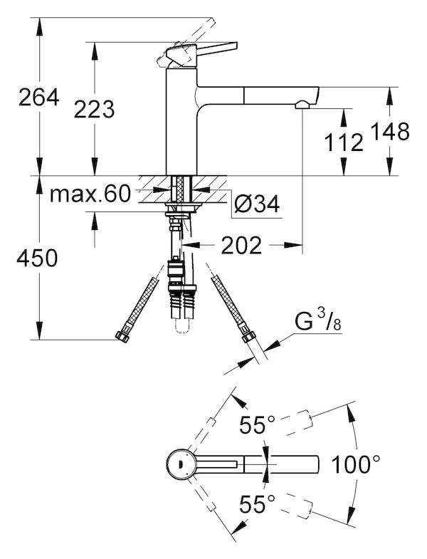Смеситель рассчитан на работу в стандартных условиях: температура воды от +5°C до +80°C, влажность до 80%. Рекомендуемое давление в сети — от 1 до 5 бар. Для подключения требуется стандартное отверстие в мойке диаметром 35 мм.