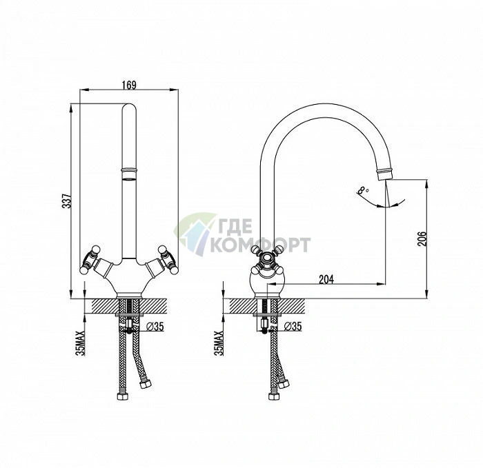 - Монтаж: Требуется стандартное монтажное отверстие в мойке или столешнице диаметром 35 мм. Комплектная установочная арматура входит в поставку.