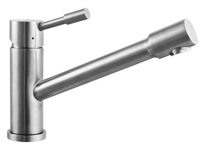 Гибкий шланг в изливе позволяет легко мыть объемную посуду и удалять загрязнения в труднодоступных уголках мойки. Система выдвижения оснащена надежным фиксатором, который удерживает шланг в нужном положении. Переключение между обычным и распыляющим режимом осуществляется одним касанием.