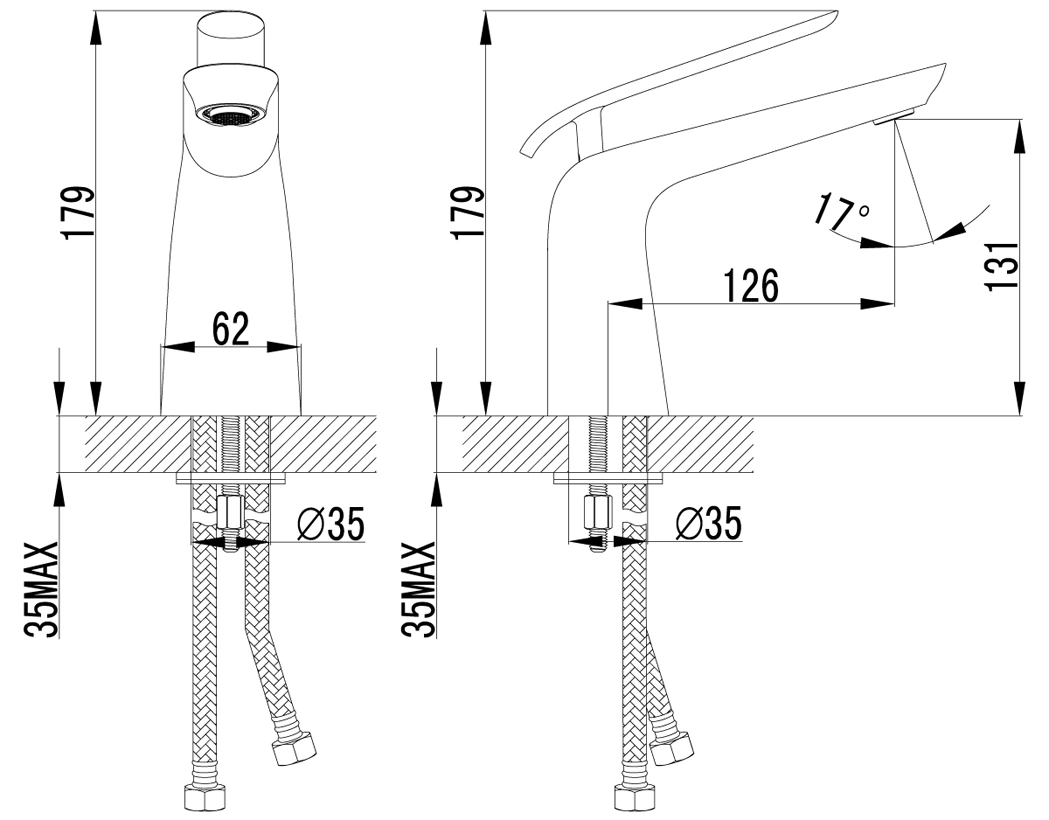 Для монтажа требуется одно монтажное отверстие в раковине или столешнице диаметром 35 мм. Компактное основание и продуманная конструкция скроют возможные сколы на поверхности. Комплектация включает все необходимые эксцентрики и гибкую подводку, что экономит ваше время на поиск аксессуаров.