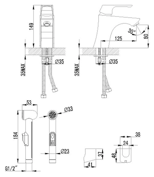 В полный комплект поставки входит сам смеситель, гибкая подводка для воды, гигиенический душ с лейкой и держателем, а также все необходимые крепежные элементы и инструкция.