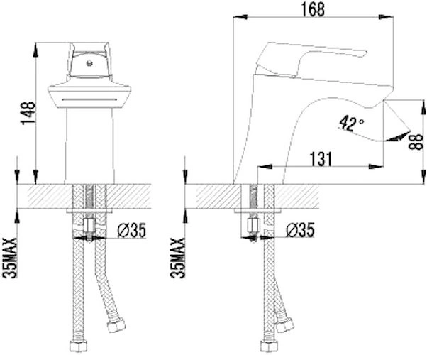 - Универсальное подключение: гибкая подводка (шланги в комплекте) стандартной длины позволяет легко установить смеситель на большинство умывальников.