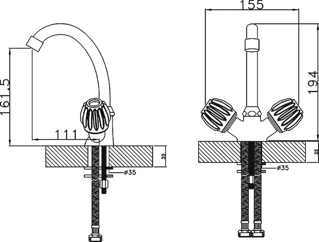 Модель N02-62 совместима с большинством стандартных раковин (моек) при межосевом расстоянии подводок 100 мм или 150 мм. Для установки необходимы: