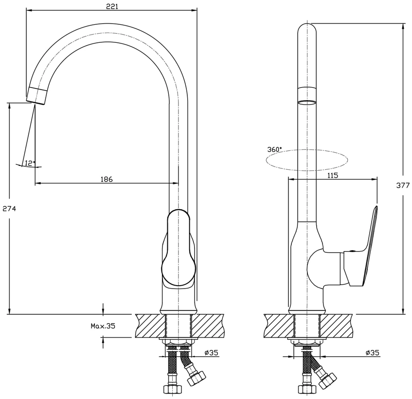 Модель CR3535-23 монтируется в стандартное отверстие диаметром 35 мм, которое есть у большинства кухонных моек из нержавеющей стали, гранита или искусственного камня.
