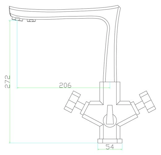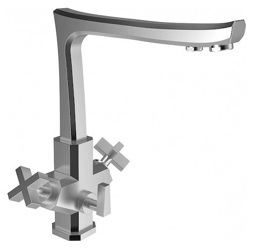 Смеситель собран по классической двухвентильной схеме с нижним подводом. Компактная компоновка внутренних узлов и продуманная геометрия корпуса обеспечивают удобный монтаж даже в ограниченном пространстве под мойкой. Все соединения выполнены для стандартной подводки 1/2 дюйма.