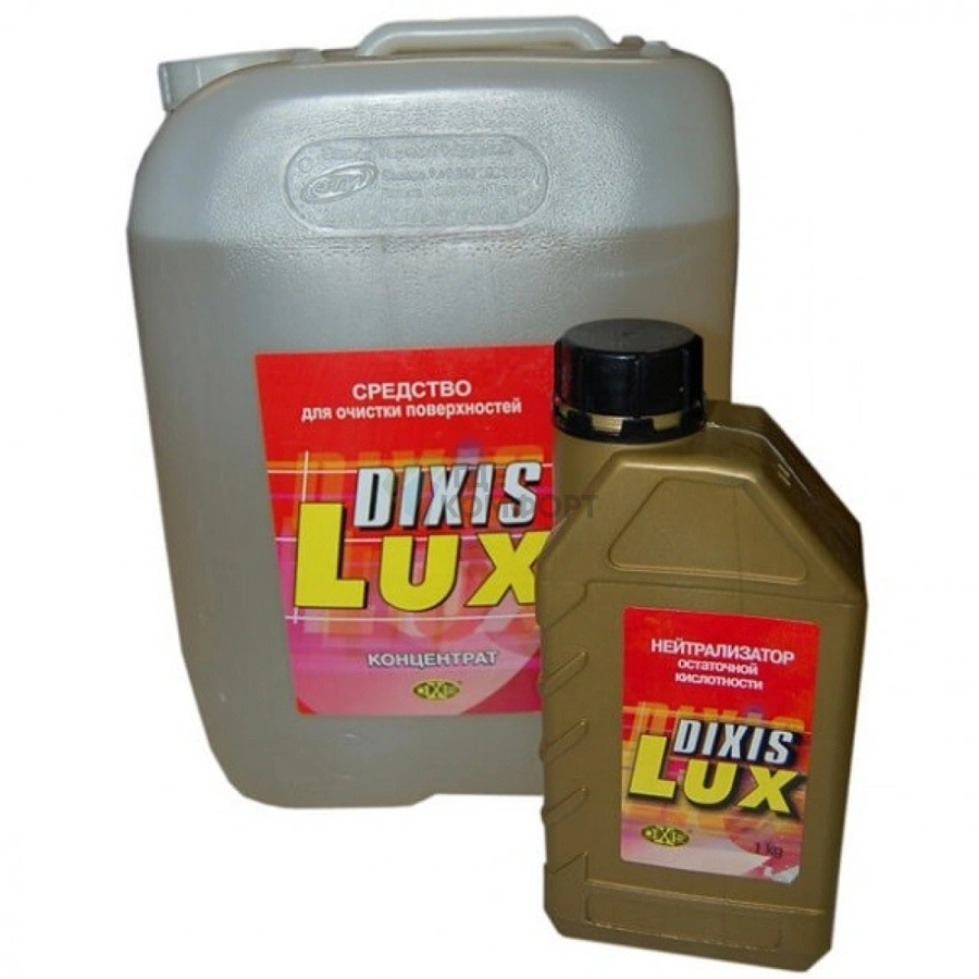 Комплект включает в себя канистру с концентрированным очищающим средством DIXIS-lux объемом 10 литров и отдельную упаковку с нейтрализующим составом массой 1 кг для финишной обработки поверхностей.
