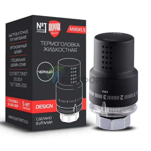 Термостатическая головка имеет резьбу M30x1.5 и легко устанавливается на большинство радиаторных клапанов, включая краны Маевского. Черный корпус Royal Thermo Design устойчив к выцветанию и гармонично сочетается с современными интерьерами. Управление интуитивно понятное: просто поверните рукоятку для выбора комфортной температуры от +6 до +28°C.